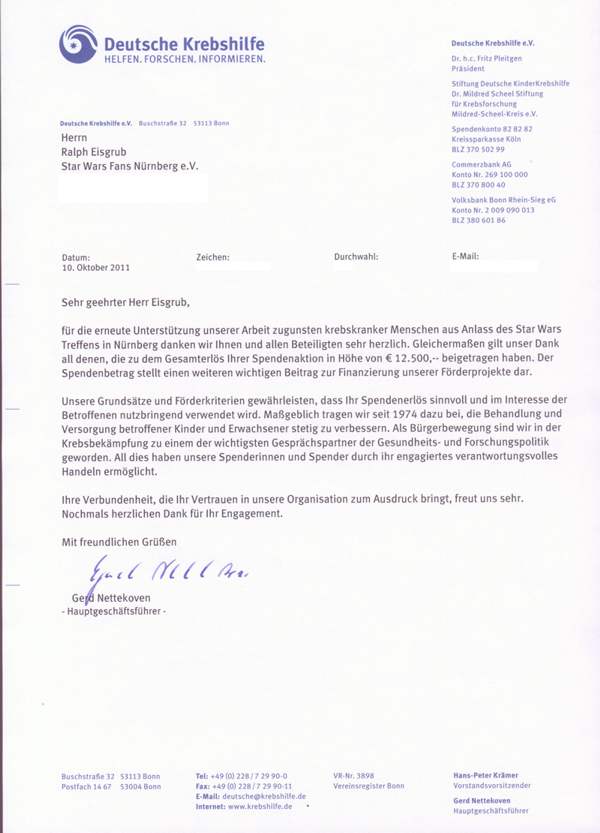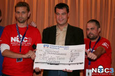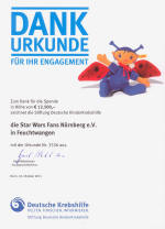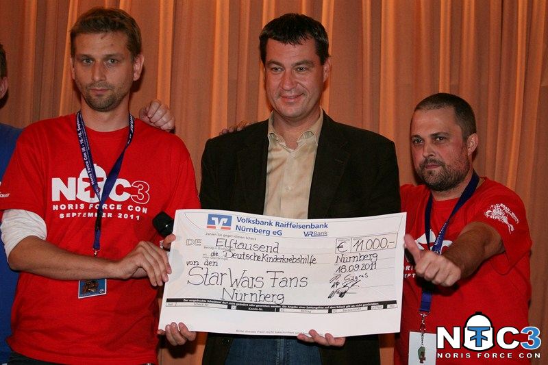 Der Höhepunkt und auch das finale Ziel der Noris Force Con war die Übergabe des Spendenschecks an die „Deutsche KinderKrebshilfe“ in Vertretung von Dr. Markus Söder in der phänomenalen Höhe von 11.000EUR! Dazu kamen die Erträge aus den prallvollen Spendendosen, die nochmals weitere 1.200EUR beinhalteten. Somit hat jeder, der an der NFC beteiligt war, zu den gesamt 12.200EUR beigetragen und wir sind stolz auf jeden Einzelnen. Diesen Stolz konnte man auch bei dem einen oder anderen sehen, wie er die Wangen herunter ran.
