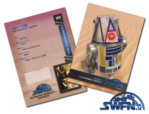 Als kleines Gimmik gibt es obendrein eine Sammelkarte der Star Wars Fans Nürnberg e.V. aus dem neuen Run, welche unser Maskottchen, den Droiden N0-R15, zeigt Die restlichen 19 Karten könnt ihr bei diversen Events von den Mitgliedern kostenfrei erfragen und unterschreiben lassen!