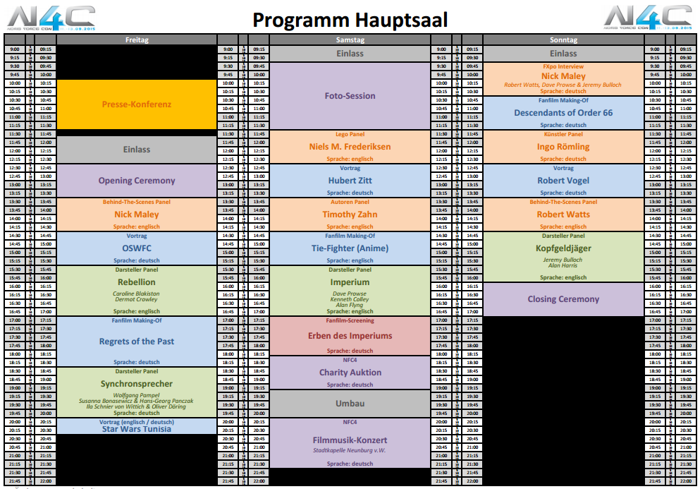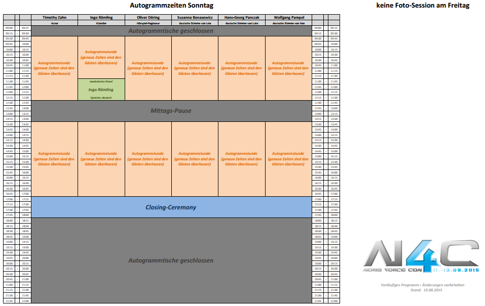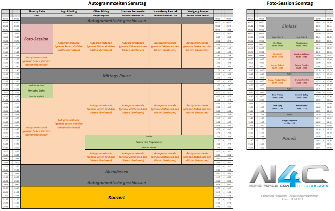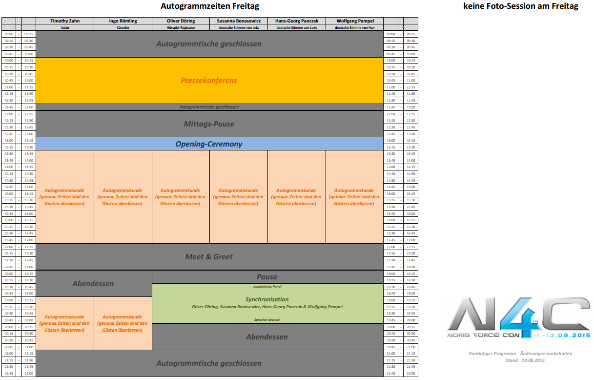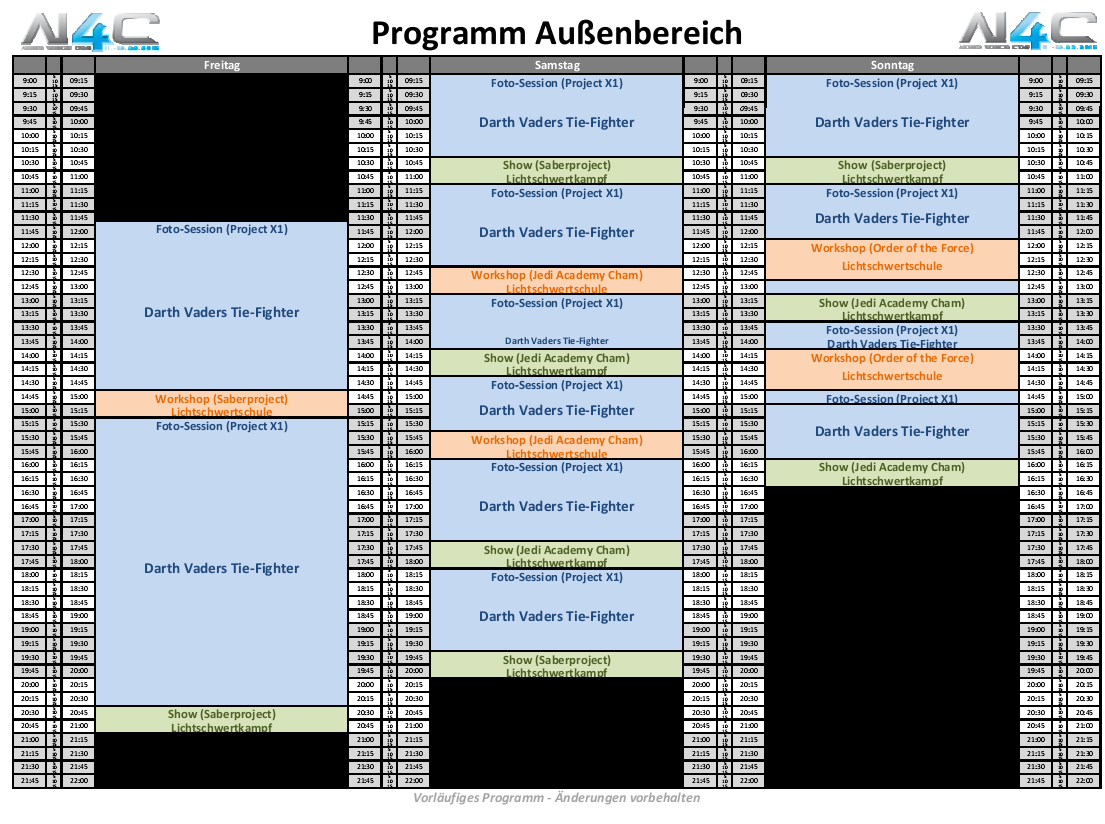 Änderungen im Programm sind natürlich nicht ausgeschlossen, werden sich aber aller Voraussicht nach nicht groß auf das Gesamt-Paket auswirken. Zeiten für Workshops und Outdoor-Aktivitäten erfahrt ihr vor Ort auf der Convention.
