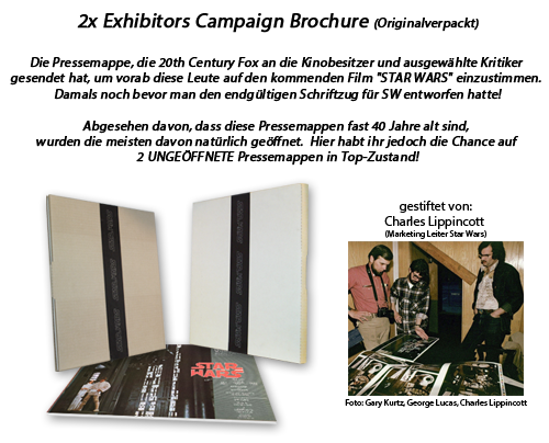 Neben George Lucas und Gary Kurtz besitzt Charles Lippincott die größte Sammlung an Original-Dokumenten zur Vermarktung von Star Wars und aus eben dieser Sammlung ließ er uns zwei „Exhibitors Campaign Brochures“ zukommen, welche im Vorfeld an Kinos und Pressevertreter geschickt wurden. Und als wären diese Presse-Sets nicht schon selten genug, sind die Exemplare, welche wir zugesandt bekommen haben auch noch originalverschweißt und in perfektem Zustand!